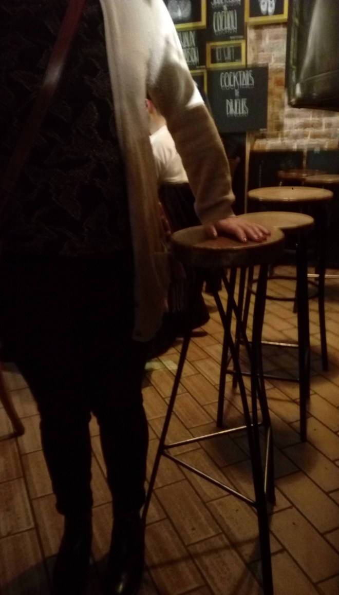 I was about to write another title for this post, something like “I demand better stools”, “We want chairs”, but then I realise how much of a #firstworldproblem this is. I can reassure you that I would choose peace over stools. Anyway. With this photo I would like to prove how unfit for their purpose this kind of stools are. 1. it’s way to high to allow people to sit comfortably. I am 1,60m small, the average height for women in Belgium us 1,65m. 2. the actual seat is also small, my ass is at least twice the width of my hand, I am sure yours is as well. So, point proven! If you have just bought/rented a bar or a restaurant think twice before being stools. Thanks.